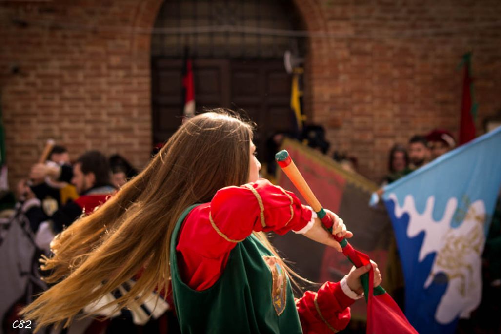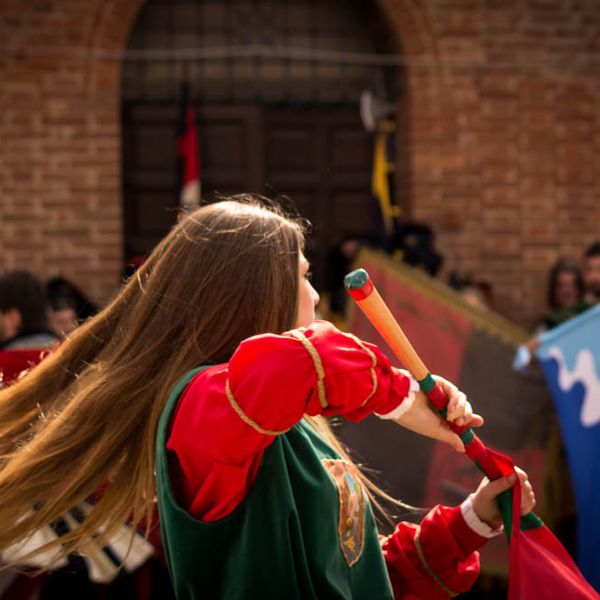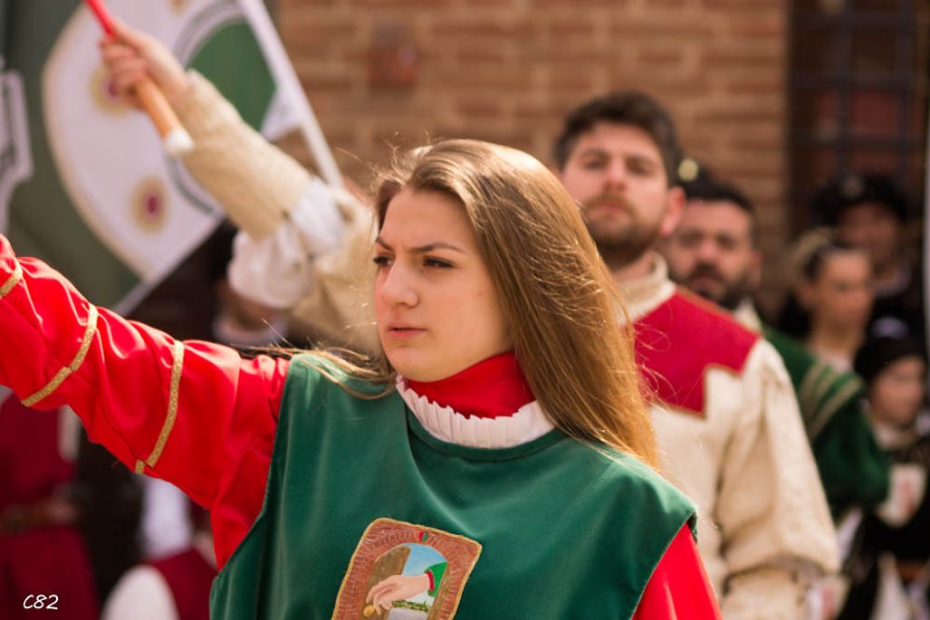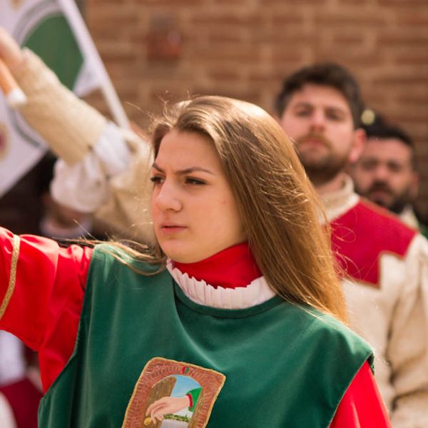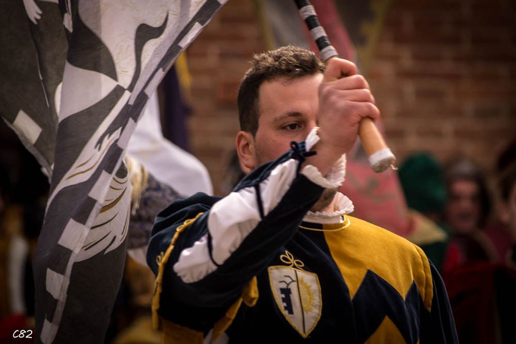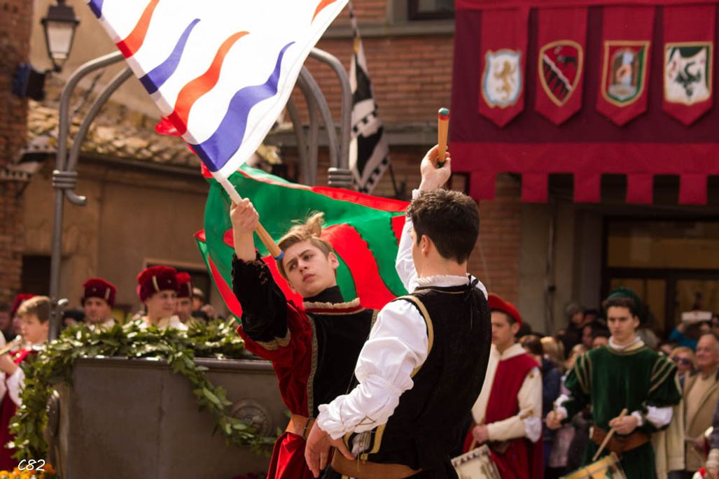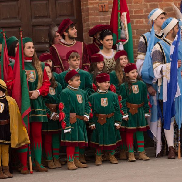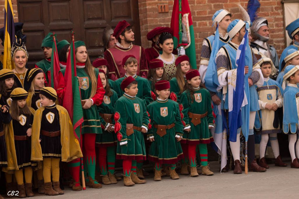 Durante i festeggiamenti del palio dei somari 2015, l'ingresso in piazza delle contrade ed il numero di gruppo degli sbandieratori e dei tamburini delle otto contrade di Torrita di Siena.