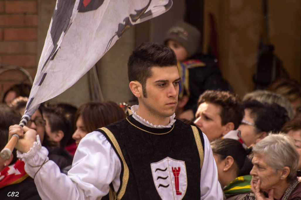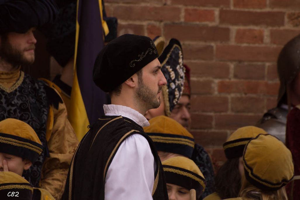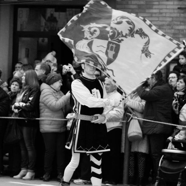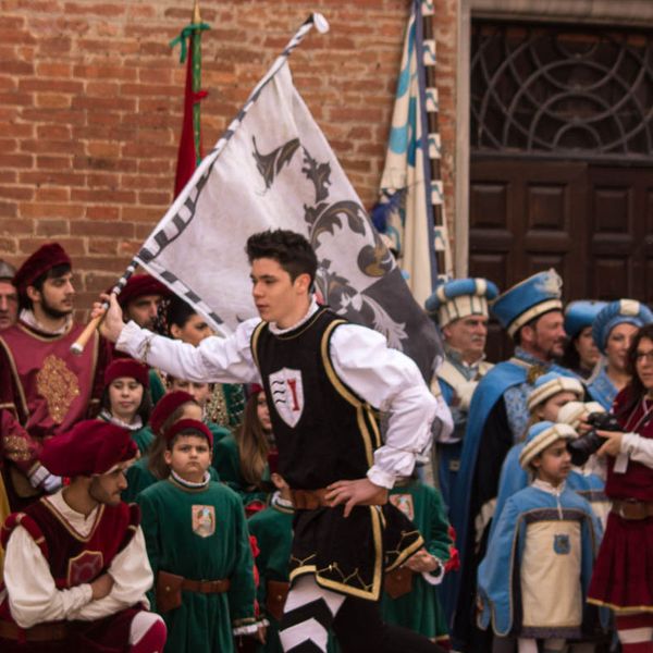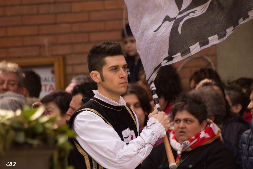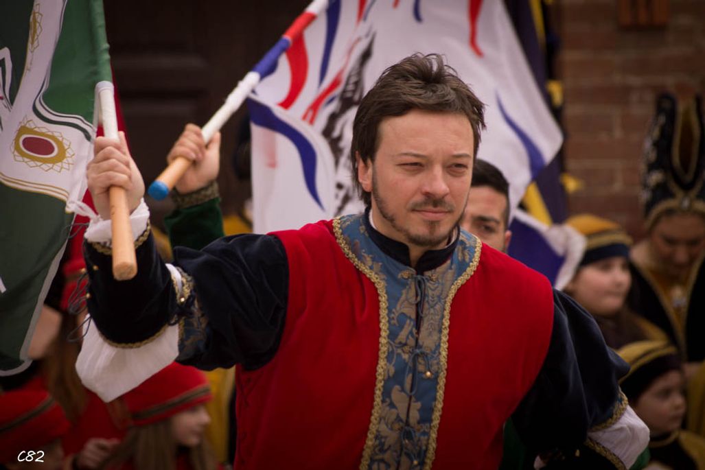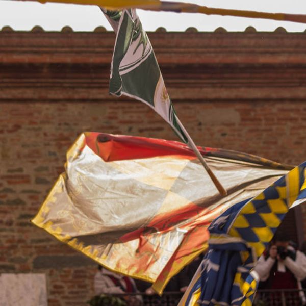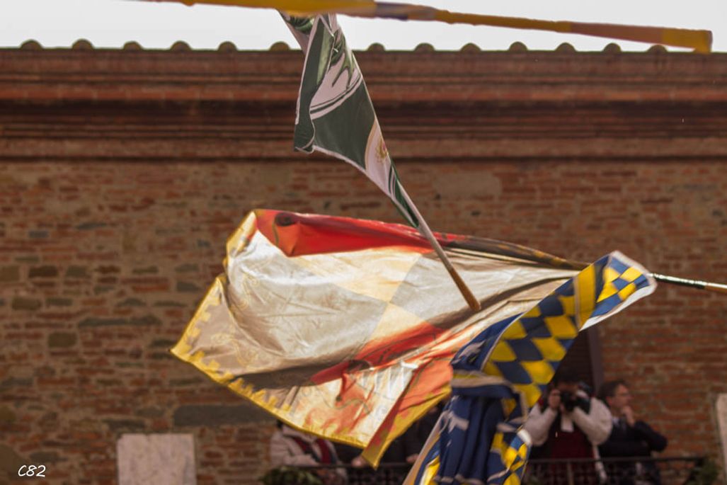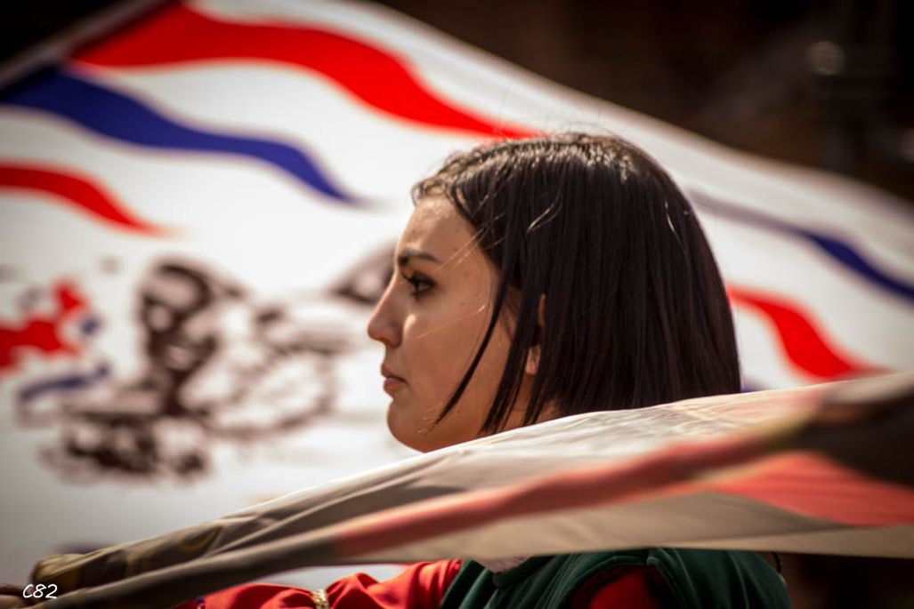 Durante i festeggiamenti del palio dei somari 2015, l'ingresso in piazza delle contrade ed il numero di gruppo degli sbandieratori e dei tamburini delle otto contrade di Torrita di Siena.