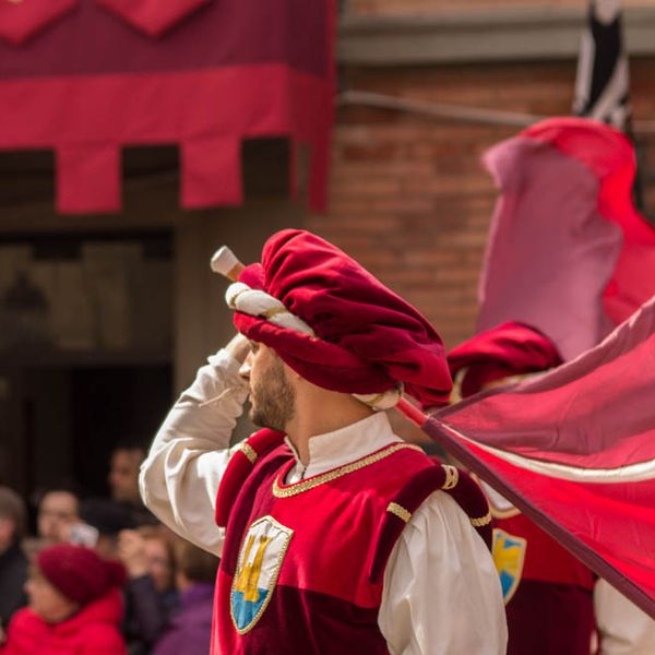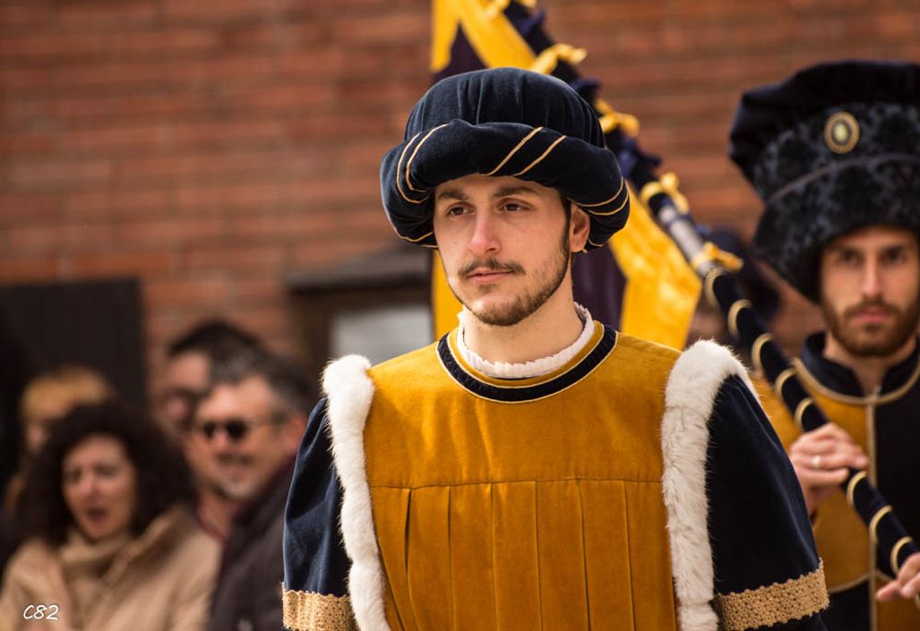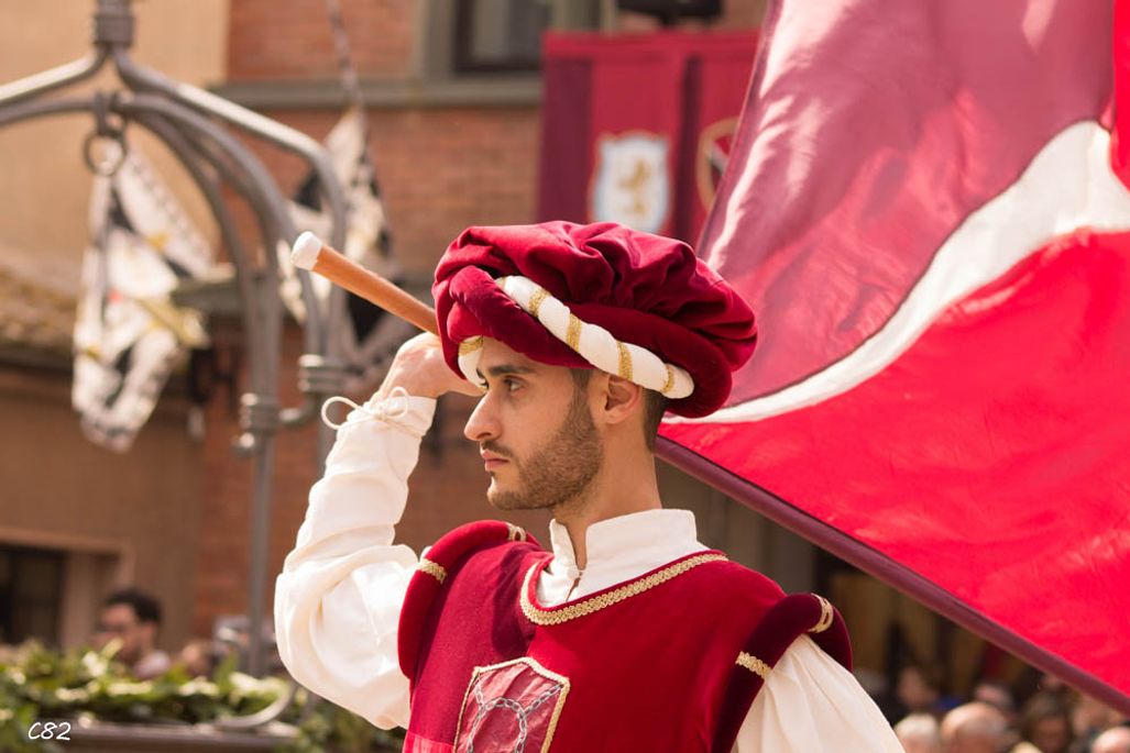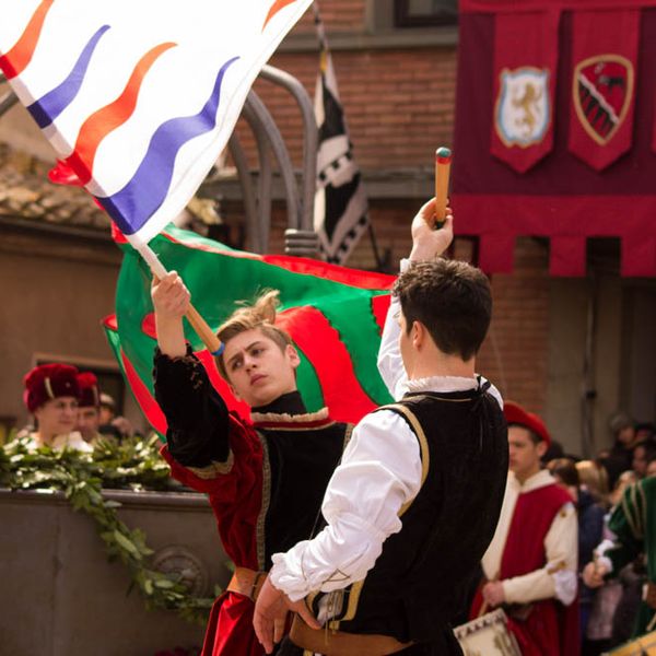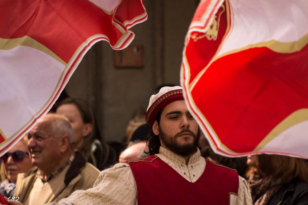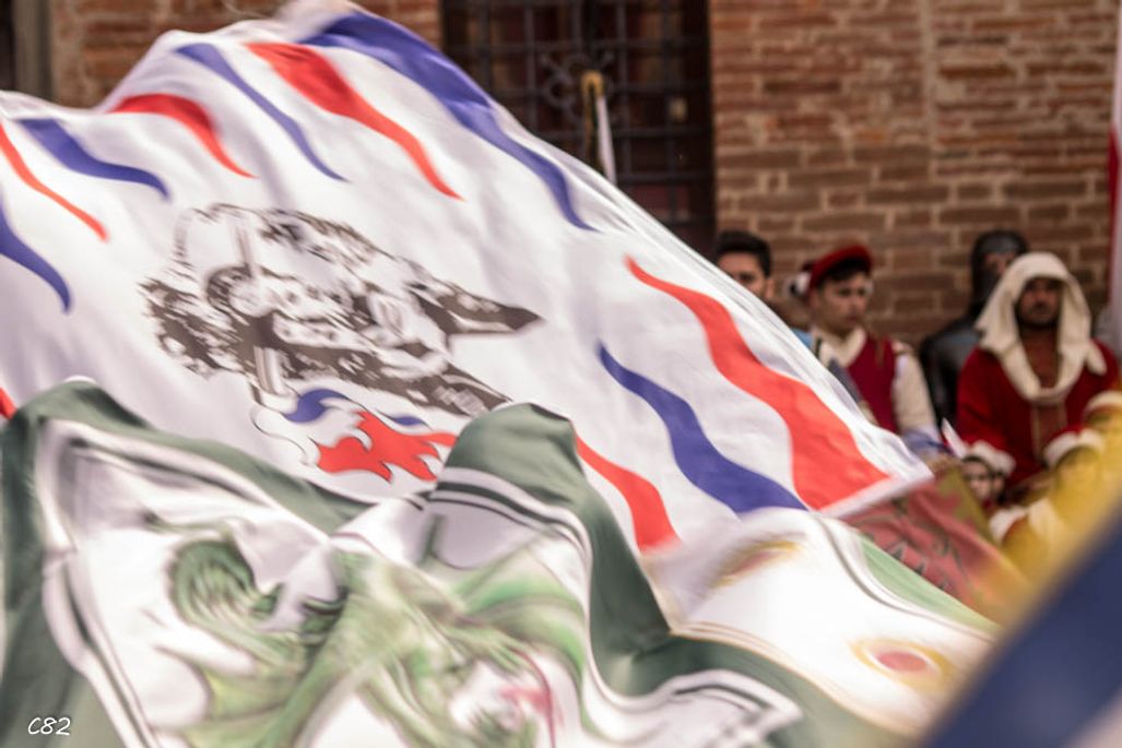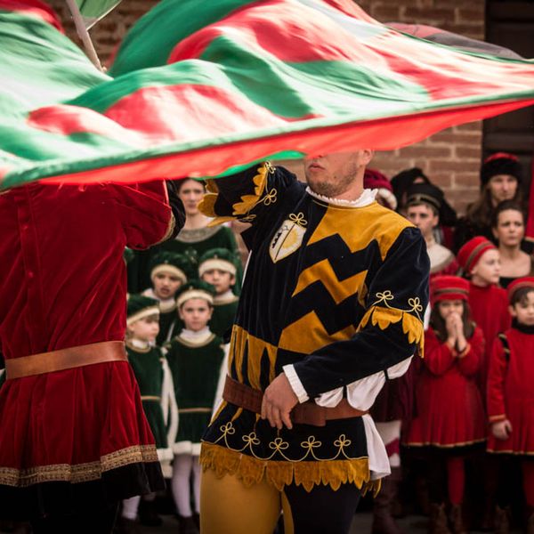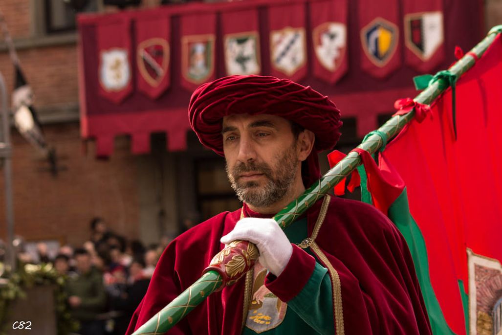 Durante i festeggiamenti del palio dei somari 2015, l'ingresso in piazza delle contrade ed il numero di gruppo degli sbandieratori e dei tamburini delle otto contrade di Torrita di Siena.